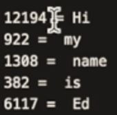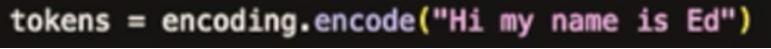 If we send the greeting “Hi, my name is Ed” to the model from our code or from a chatbot, what it receives is a sequence of numbers. The sentence in parentheses below is encoded – translated into a sequence of numbers to the right of the equals sign – and that sequence is entered on the left under “tokens.”